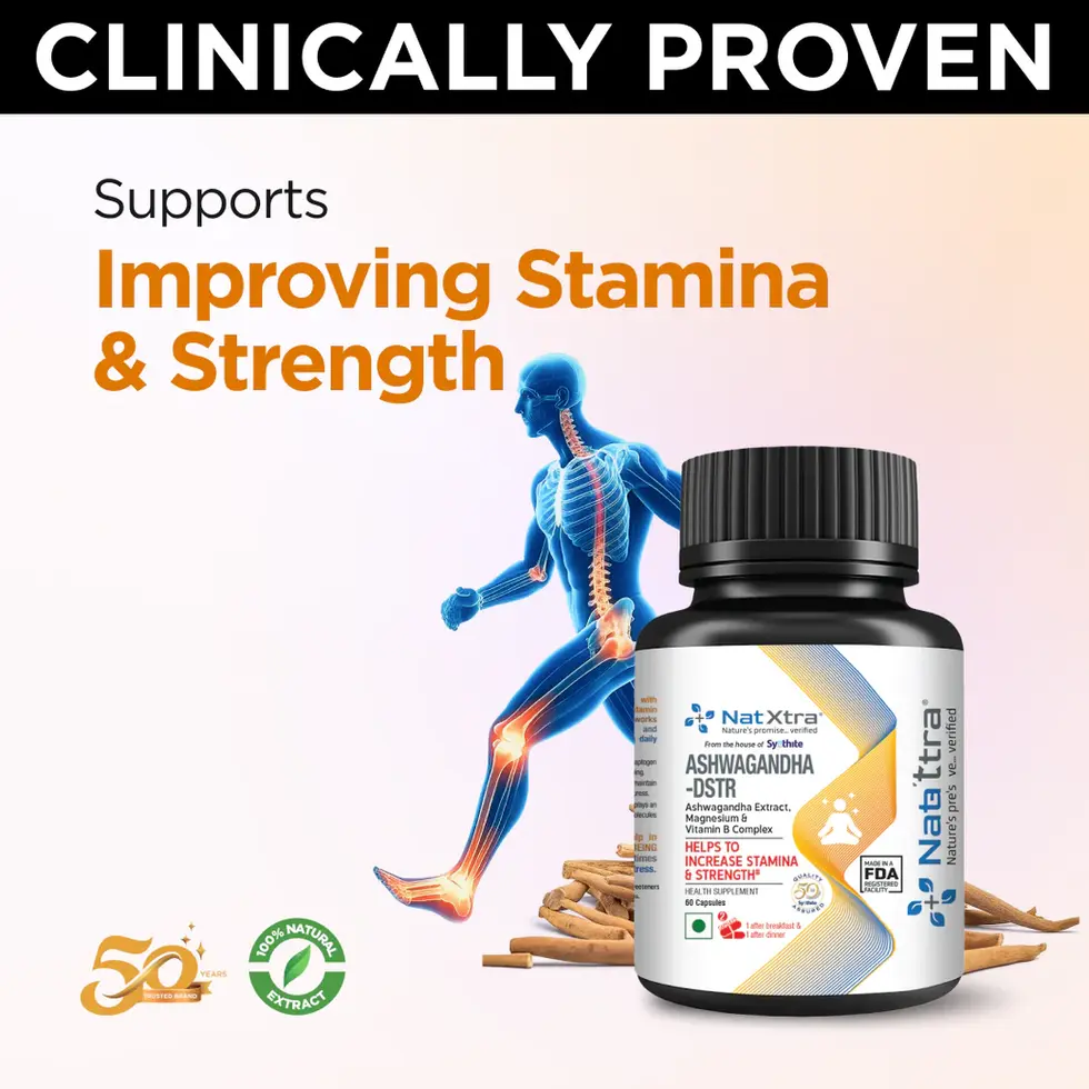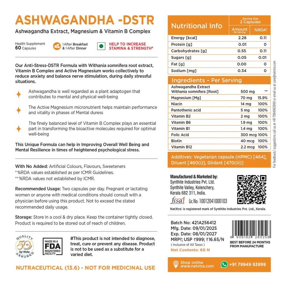 NatXtra Ashwagandha-DSTR is a nutraceutical designed to naturally enhance energy, stamina, and mental resilience. Powered by pure Ashwagandha root extract, Active Magnesium, and Vitamin B Complex, this unique formula helps reduce stress, support nerve function, and maintain vitality during daily challenges.